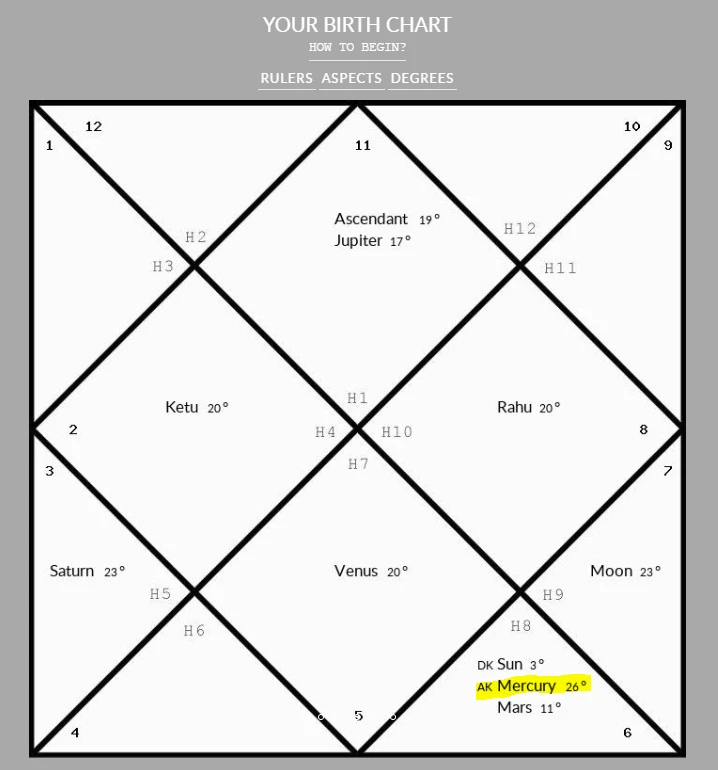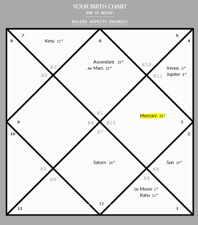 만약 수성이 KETU (달의 남쪽 노드행성)과 같이 위치해 있다면 더욱 더 컴퓨터 프로그래밍쪽이 본인의 진로에 잘 맞고, 재능이 있는 차트입니다.