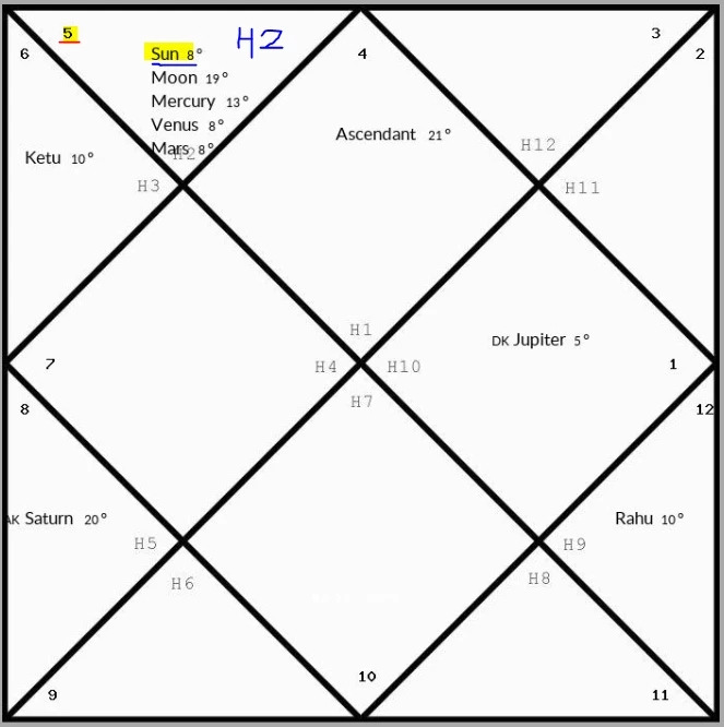 어쨌거나 그럼 이 차트는 2하우스 로드가 2하우스에 있다! 라고 풀이할 수 있겠네요.