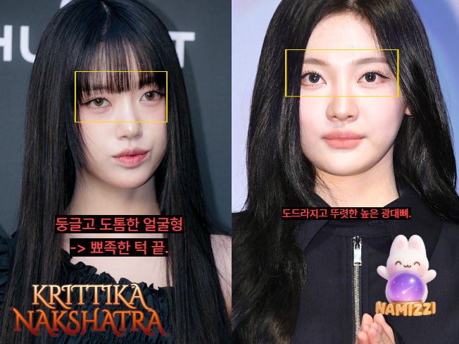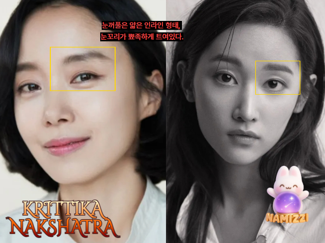 부드럽고 순수한 이미지 + 중성적인 서늘한 분위기의 합 같달까.. 그래도, 크리티까 낙샤트라만 보았을 때는 동글동글한 동안미도 대표적인 특징입니다. 근데, 이게 점점 성숙해질 수록 서늘한 분위기가 같이 커져나오는 것을 확인할 수 있었습니다. 눈꺼풀이 눈동자 윗 부분을 감싸줘서 그런 눈빛이 같이 가미 되는 것 같기도 합니다.