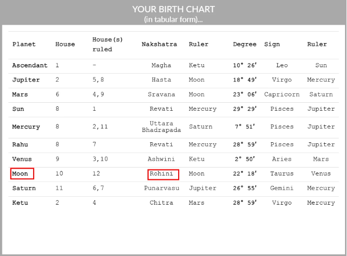 ㄴ 위 차트 예시는 달 낙샤트라가 Rohini 로히니 낙샤트라인 경우입니다.