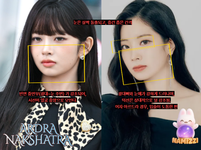 전반적으로 차가운 냉미남, 냉미녀 느낌으로 볼 수 있겠습니다. 여자 분들은 조금 귀여운 이미지가 강한 연예인 분들이신 것 같지만, 은근 마냥 귀여운 컨셉보다는 다크한 컨셉이 *남녀불문 잘 어울린답니다. 또 아르드라 낙샤트라 경우 라후적 특성 덕분에 시각적인 자극에 강한 편이에요. 그래서, 흔히 말하는 사진빨, 카메라빨, 조명빨 (?) 잘 받는 타입입니다.