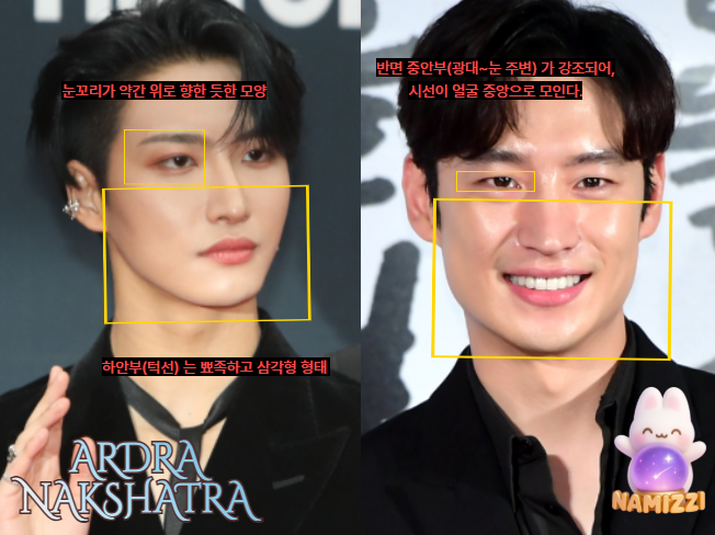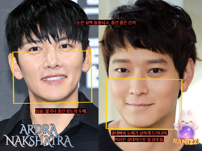 이번 예시는, 아르드라 낙샤트라 중에서도 조금 진한 분들의 예시입니다. 배우 지창욱님과 강동원님입니다. 두분 다 하안부가 비슷한 형태라인이죠. 귀 모양도 긴 편에 속합니다. 남자 아르드라 경우 입술이 약간은 얇은 편입니다.